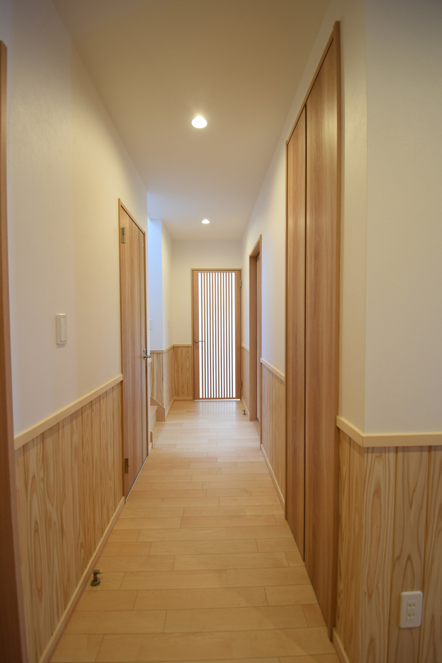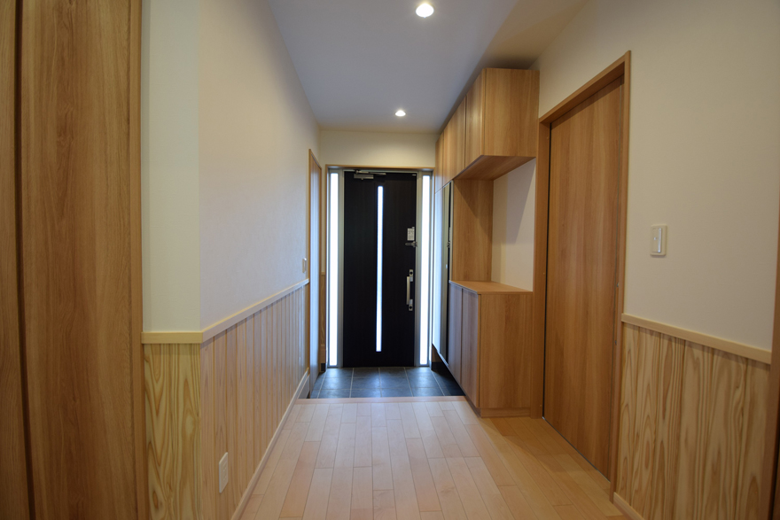 モダンな色使いの外観とは対照的に無垢材をふんだんに使った木のぬくもりの感じられる内装の家です